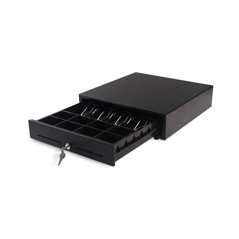 Ladica za novac MS 410, 5 novčanice/ 8 kovanice, Epson standard RjJ11, RJ12, 410(Š)x420(D)x100(V), metalna konstrukcija, 7,6kg, 6V/9V/12/24V crna